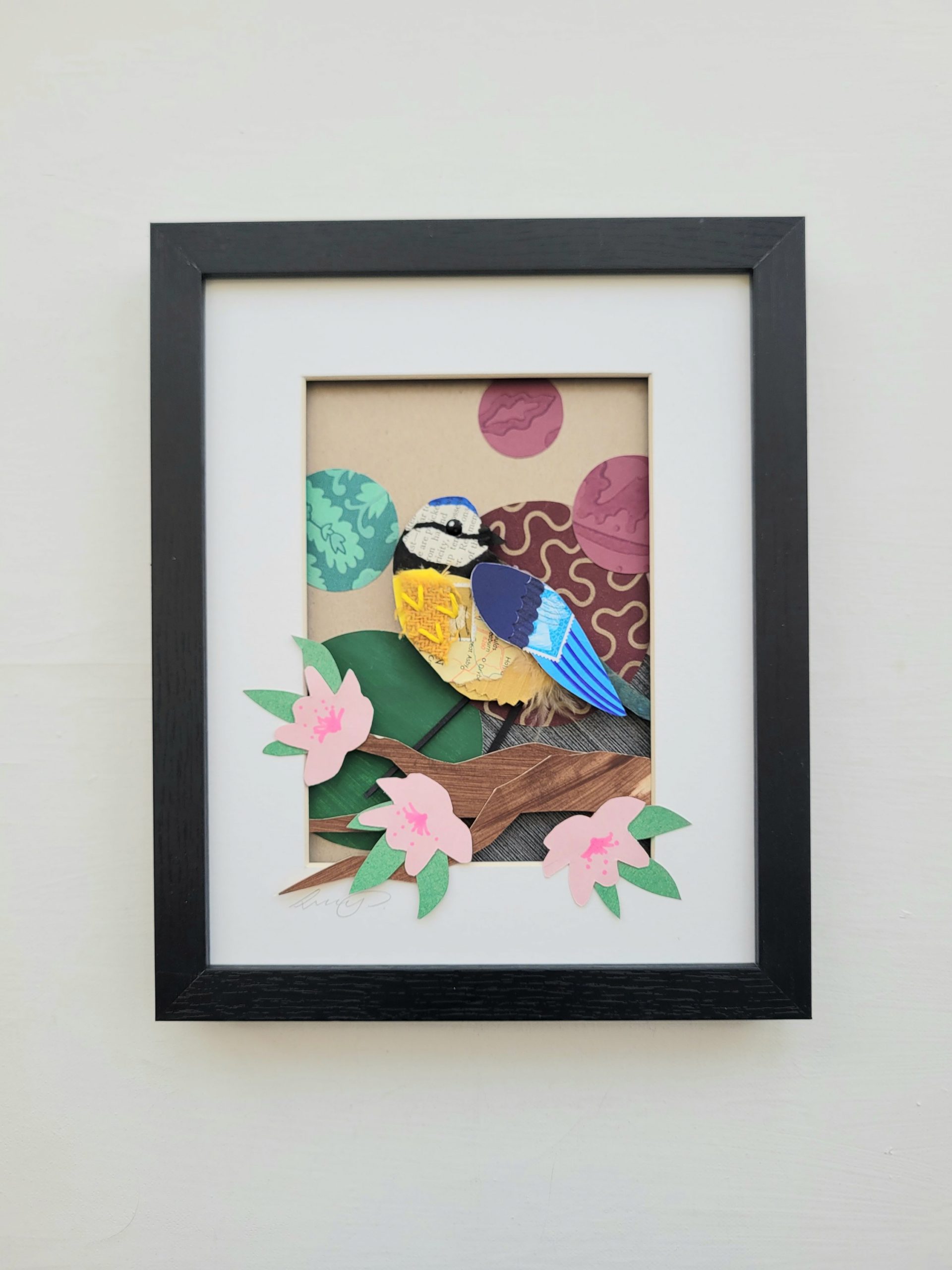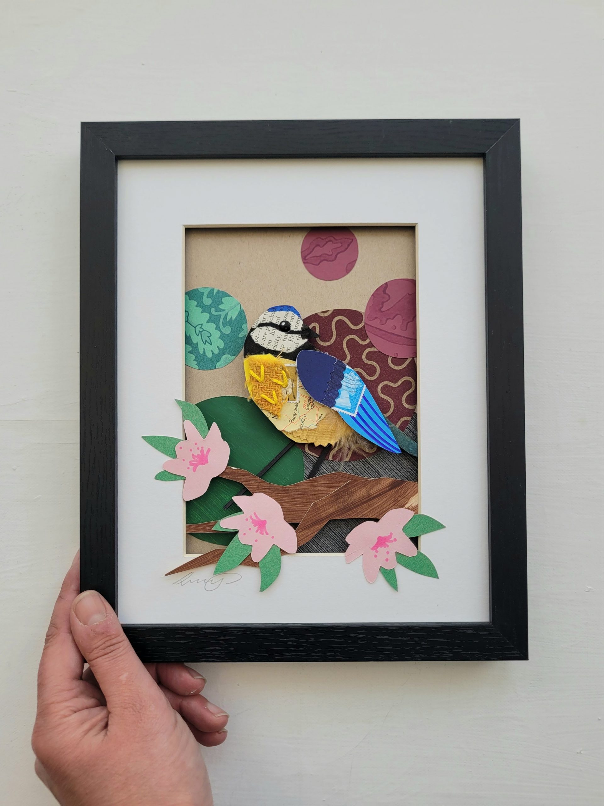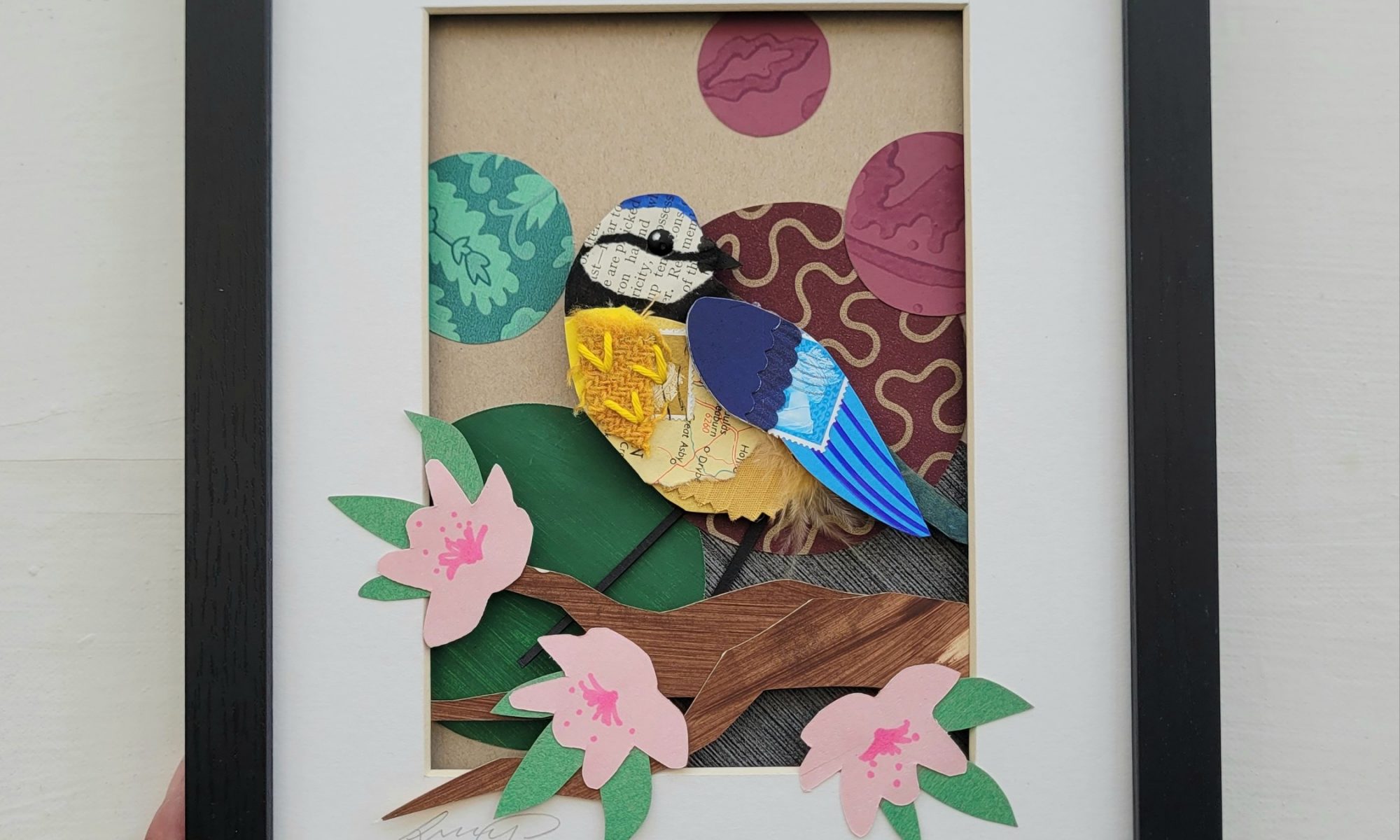 The background is made using end of season wallpaper samples and the bird is a combination of corrugated card, salvaged paper and fabric scraps, and reclaimed buttons