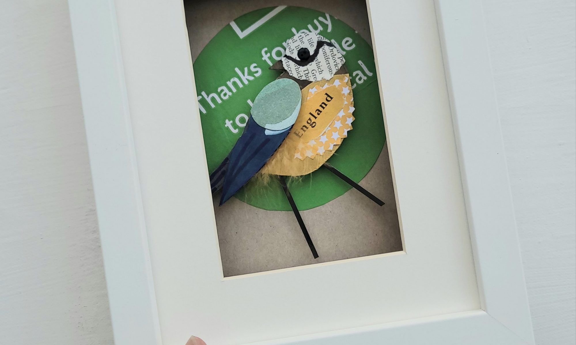End of Season Wallpapers, corrugated card box, fabric scraps, doll button and cerial packaging.